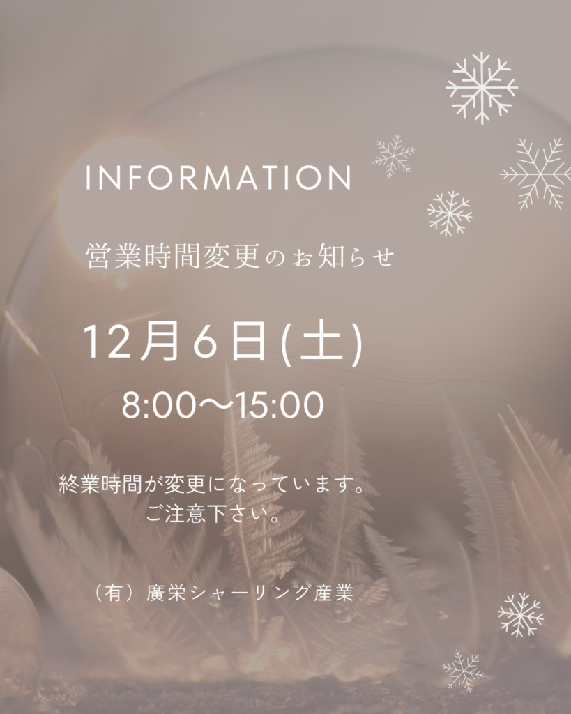 HOME > お知らせ > お知らせ > 12月6日 営業時間変更のお知らせ HOME > お知らせ > お知らせ > 12月6日 営業時間変更のお知らせ お知らせ 2025/11/27 12月6日 営業時間変更のお知らせ 12月6日(土) 下記のとおり、営業時間の変更をさせていただきます。 お取引先様におかれましては大変ご不便をおかけいたしますがご理解いただきますようお願い申し上げます。 12月8日(月) より通常通り営業させていただきますのでよろしくお願いいたします。 前へ 次へ お知らせ一覧へ